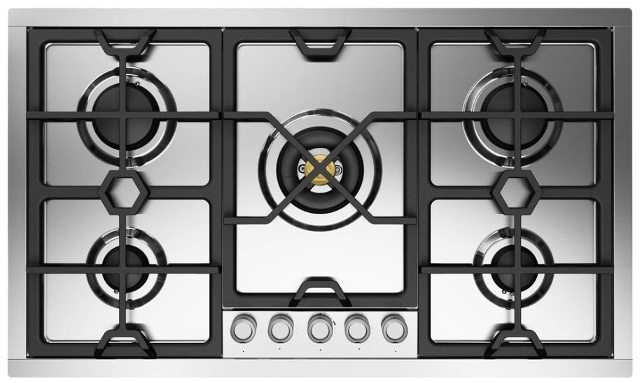 The 36" built-in gas cooktop features 5 burners, designed for both style and functionality in stainless steel. It includes heavy cast iron pan grates for durability and stability while cooking. The cooktop is equipped with Total Black brass burners that feature a non-stick nanotechnological coating, ensuring easy maintenance and enhanced cooking performance.Read More