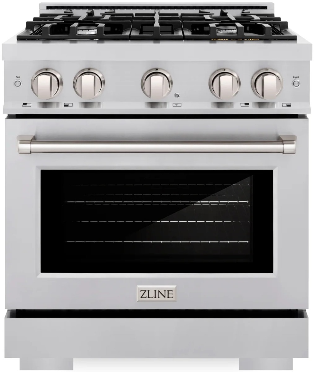 The ZLINE 30 in. 4.2 cu. ft. Select Dual Fuel Range with 4 Burner Gas Cooktop and Electric Convection Oven in Satin Stainless Steel (HDRS-30) combines the elegance of a hand-finished porcelain gas cooktop with 4 Italian-made auto-reignition burners, an electric convection oven with an energy-efficient cooling fan to ensure quiet operation, and a Horizon oven door window design allowing you to master every meal.